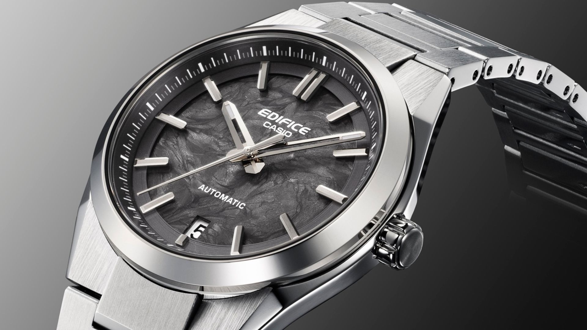 The new EFK-100CD is a mechanical timepiece that, for the first time in the EDIFICE line, employs forged carbon — a lightweight and high-strength material used in high-end sports cars and custom automotive parts — for the dial. Forged carbon creates a truly one-of-a-kind appearance in each timepiece, as carbon fiber blended into the resin forms unique, random surface patterns. The simple dial design, with just three hands and a date display, highlights the distinctive character of forged carbon.