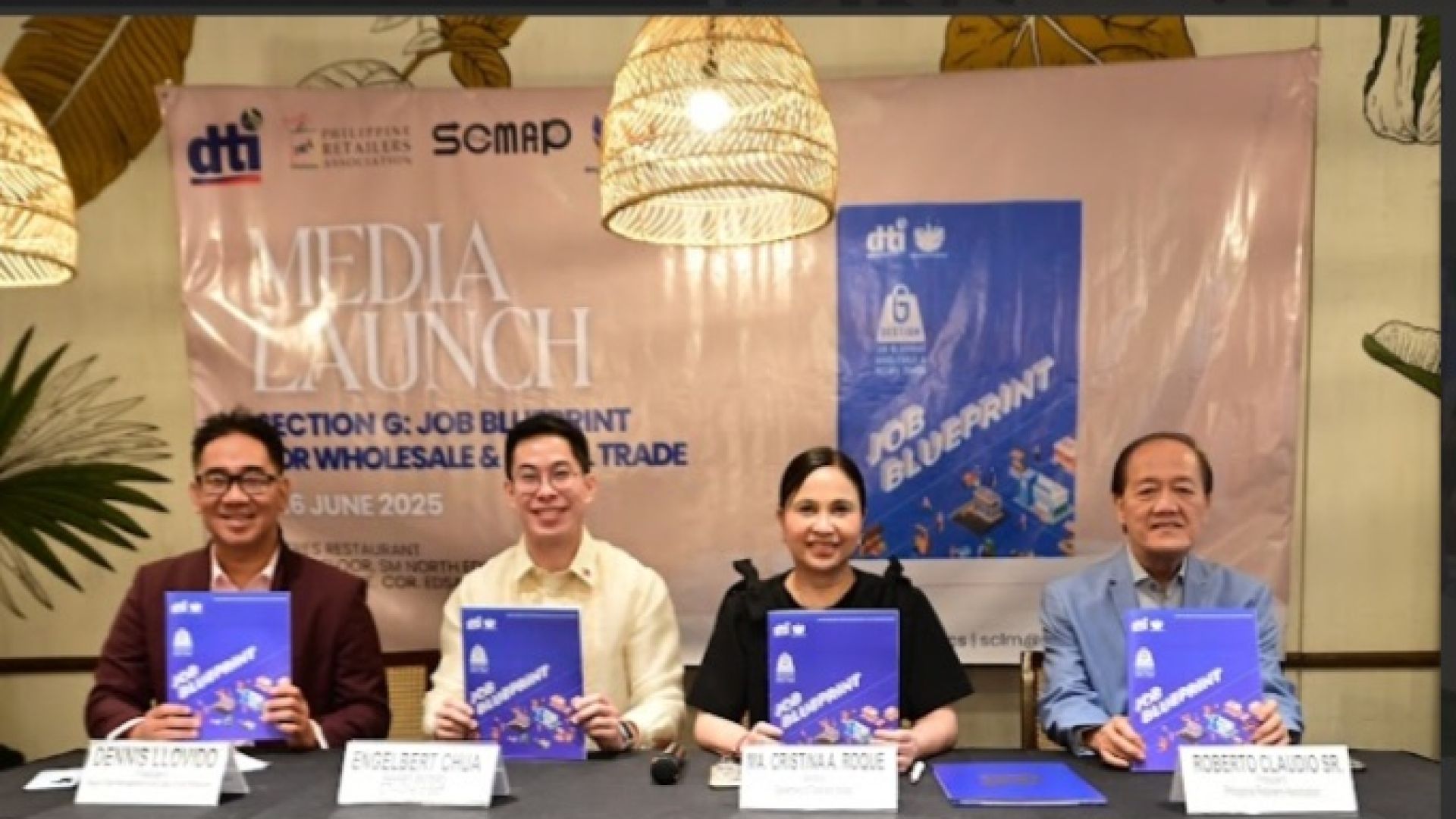 (L-R): Supply Chain Management Association of the Philippines (SCMAP) President Dennis Llovido, Department of Trade and Industry (DTI) Assistant Secretary Engelbert Chua, DTI Secretary Cristina Roque, and Philippine Retailers Association (PRA) President Roberto Claudio Sr. attend the media launch of the Section G: Job Blueprint for Wholesale and Retail Trade on June 16, 2025, at SM North EDSA.
